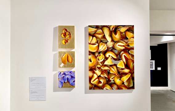 “Write your own fortune” is a series reinterpreting fortune cookies as a symbol of identity, expectation and authorship. As we traditionally seen it as a playful or representation of Chinese-ness, the painting with gold gilding hinting the combination and influences of different cultures.